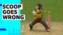 Johnson Charles’ attempt at a scoop shot goes wrong as the batsman directs the ball through his legs and onto the stumps to leave West Indies on 117-4 in the second T20 International against England in Bristol.