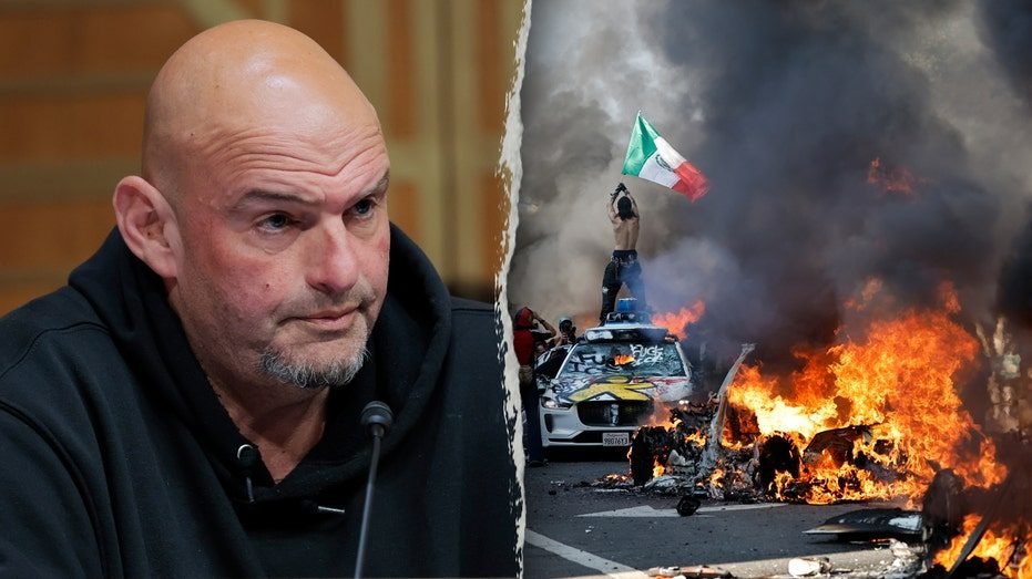 Fetterman issued a strong message on X Monday evening denouncing the riots in Los Angeles and included a now-infamous photo showing a rioter standing on a car while waving the Mexican flag surrounded by raging flames.