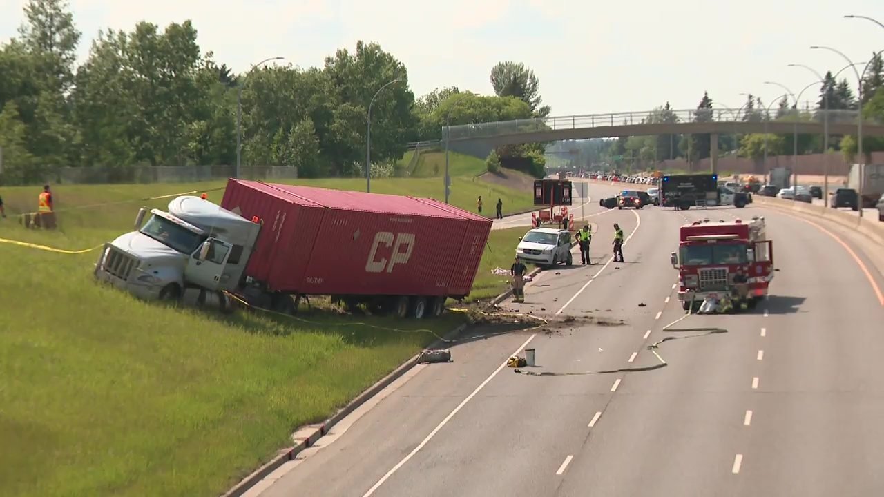 A woman who got out of her vehicle on Whitemud Drive was struck by a semi and killed, and her van containing a child was also hit on the south Edmonton freeway Tuesday afternoon.
